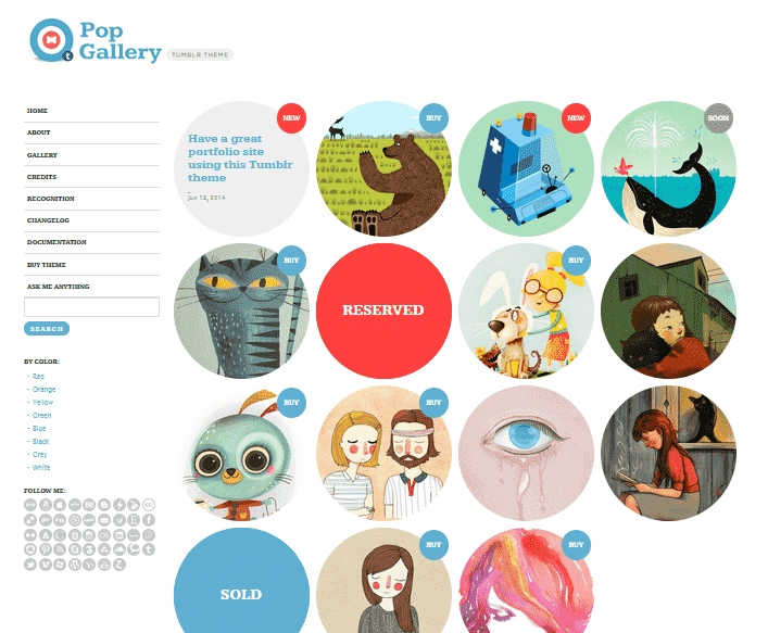 Pop Gallery is an elegant, clean, fast and aesthetic responsive eCommerce Tumblr theme with circular thumbnails. It presents distinct thumbnails for New, Sold and Reserved products using Overlay Tags. The Bubble Tags such as Buy, New, Soon, and Sale, are used to call attention to the product.