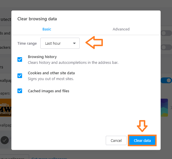 Click on the Advanced tab. Select the Time range. Check the options whose data you want to clear such as Browsing history, Download history, Cookies and other site data, Cached images and files
