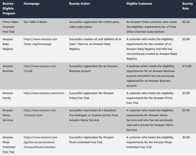 If someone sign-ups for a free trial subscription of an Amazon service you get a fixed amount. The money or commission you will earn for trial sign-up is called Bounty. The exact criteria for qualification has been mentioned in “Eligible Customer”column.