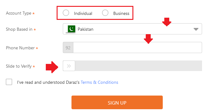 - Choose Account Type. There are two types of seller accounts on Daraz: Personal and Business. They have been explained in Section 7 above.